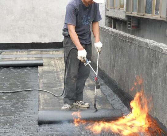 第三步:將卷材擺正,采用熱熔法施工,點(diǎn)燃噴槍均勻加熱卷材和基面,待卷材表面出現(xiàn)熔化并呈黑色光亮狀后迅速推動(dòng)卷材進(jìn)行粘接,并將粘接面輥壓平實(shí)。施工完畢,應(yīng)再用冷粘劑對(duì)搭接邊進(jìn)行密封處理。
